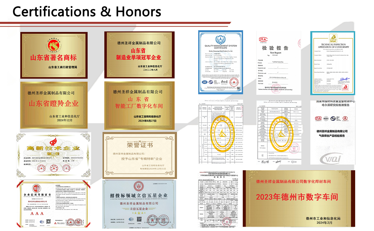 Dezhou Shengxiang Metal Products Co., Ltd., established in 2006, is situated in the Economic Development Zone of Lingcheng District, Dezhou City, Shandong Province. Spanning an area of ​​over 100 mu, it is a limited liability company specializing in the integrated research and development, production, and sales of welding materials. Its primary product portfolio includes copper-free welding wires, gas-shielded welding wires, submerged arc welding wires, TIG welding wires, weather-resistant and heat-resistant welding wires, high-strength welding wires, aluminum alloy welding wires, titanium alloy welding wires, copper alloy welding wires, and a diverse range of welding electrodes. These products are widely utilized across various sectors, including shipbuilding, pressure vessels, bridge construction, railway rolling stock, and heavy machinery; furthermore, the company’s high-end products are capable of meeting the rigorous demands of advanced industries such as defense, offshore engineering, and nuclear power.